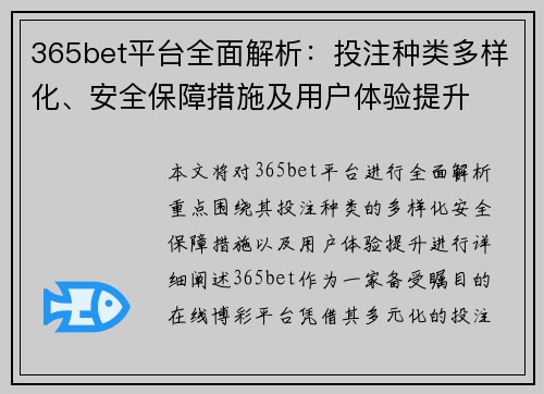 本文将对365bet平台进行全面解析,重点围绕其投注种类的多样化、安全保障措施以及用户体验提升进行详细阐述。365bet作为一家备受瞩目的在线博彩平台,凭借其多元化的投注选项和先进的安全防护措施,吸引了大量用户。平台不仅提供丰富的体育赛事和娱乐博彩选择,还在技术和服务上持续优化,以提升用户体验。文章将从四个方面逐一分析,分别为:投注种类的多样化、安全保障措施的完善、用户体验的提升以及总结归纳。通过这些分析,读者可以全面了解365bet平台在现代博彩行业中的优势及发展方向。